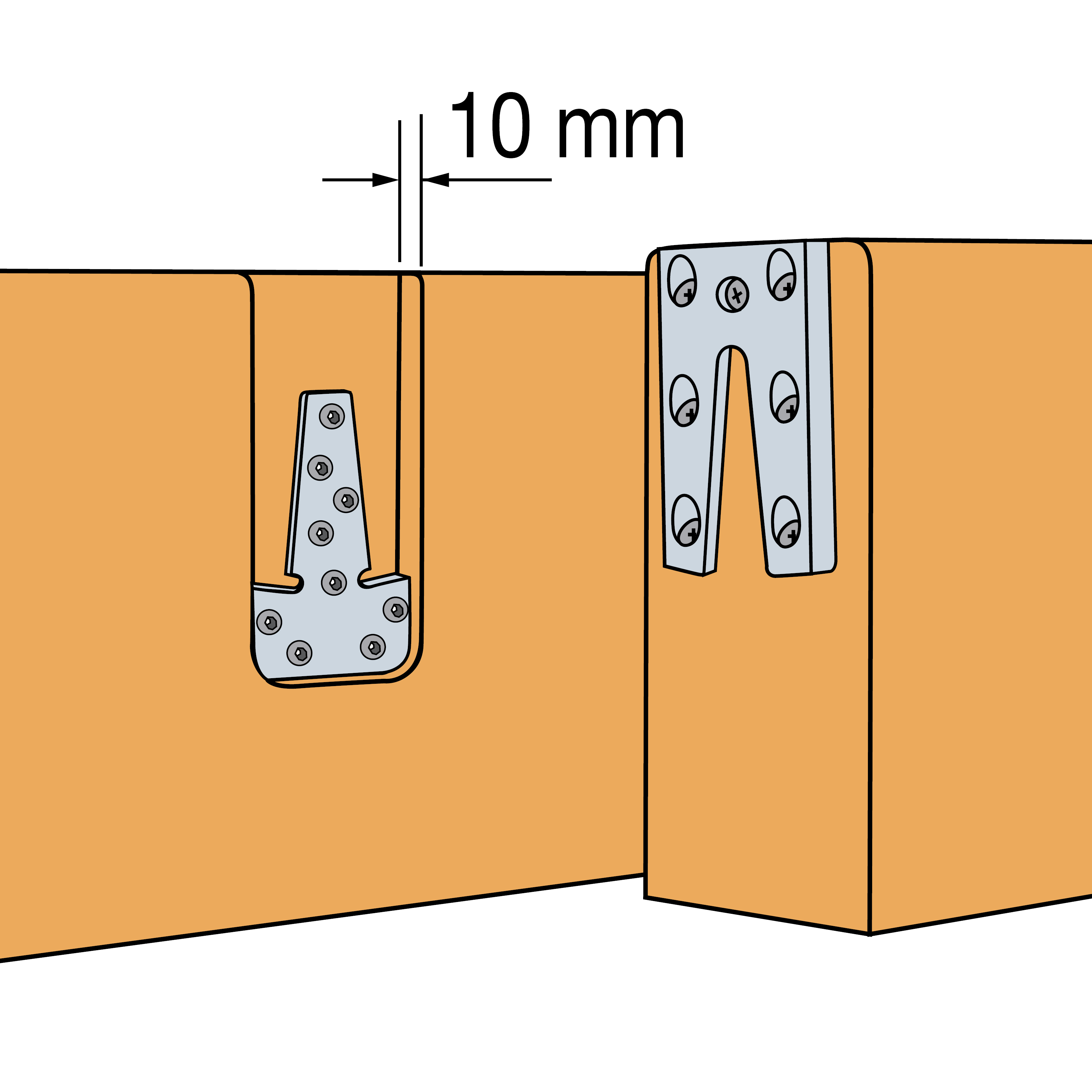 The ETB concealed connector comes in two parts. The first is fixed to the header timber with nails provided, while the second part is fitted to the end of the beam with screws.