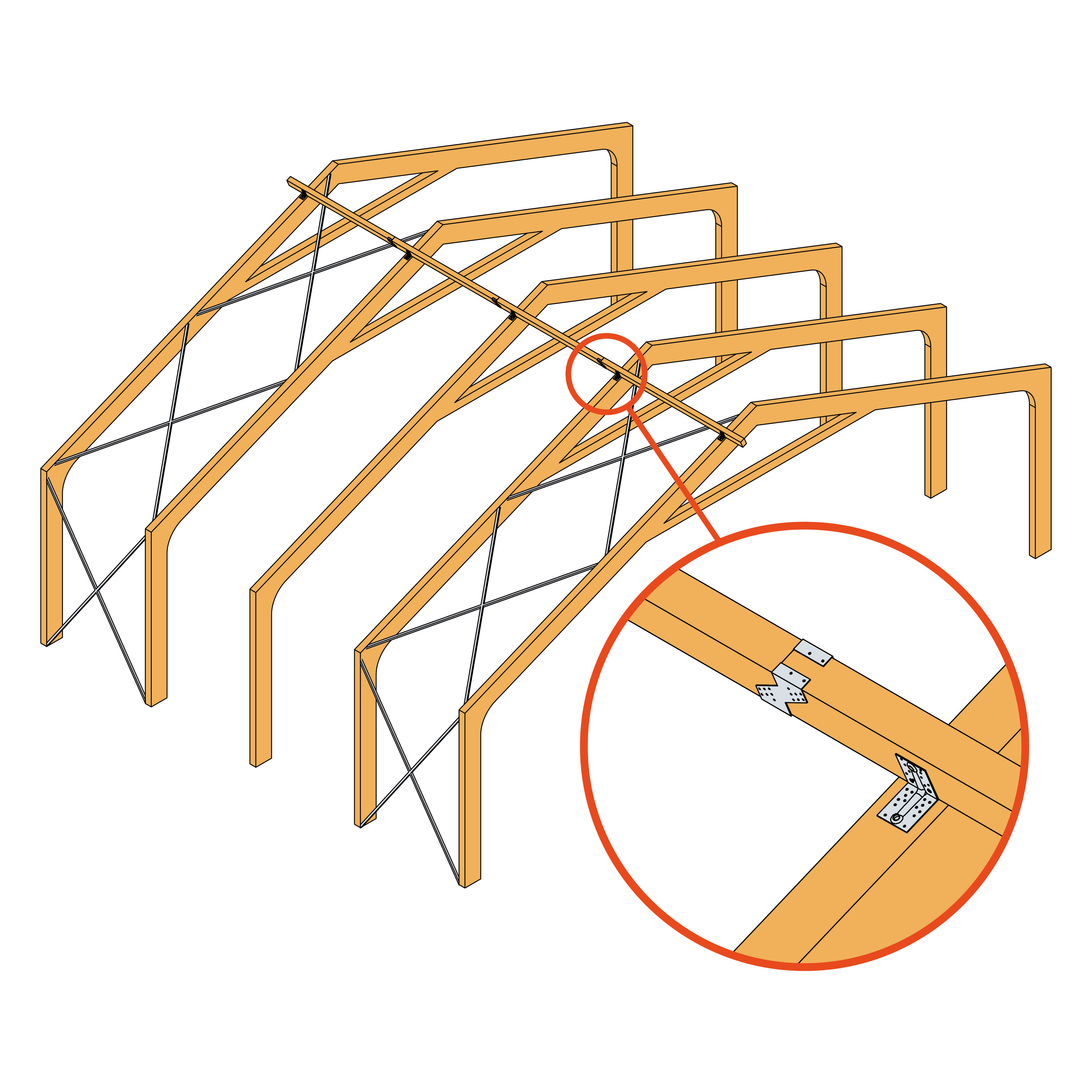 Gerber joints are available for the most common timber dimensions. The set of couplings consists of a right and left end portions and can be used for purlins from 80 mm width. The maximum height of the connector corresponding to the cutting diameter of the wood in standard sizes. Depending on the load, the connection can be performed through a partial or full nailing.